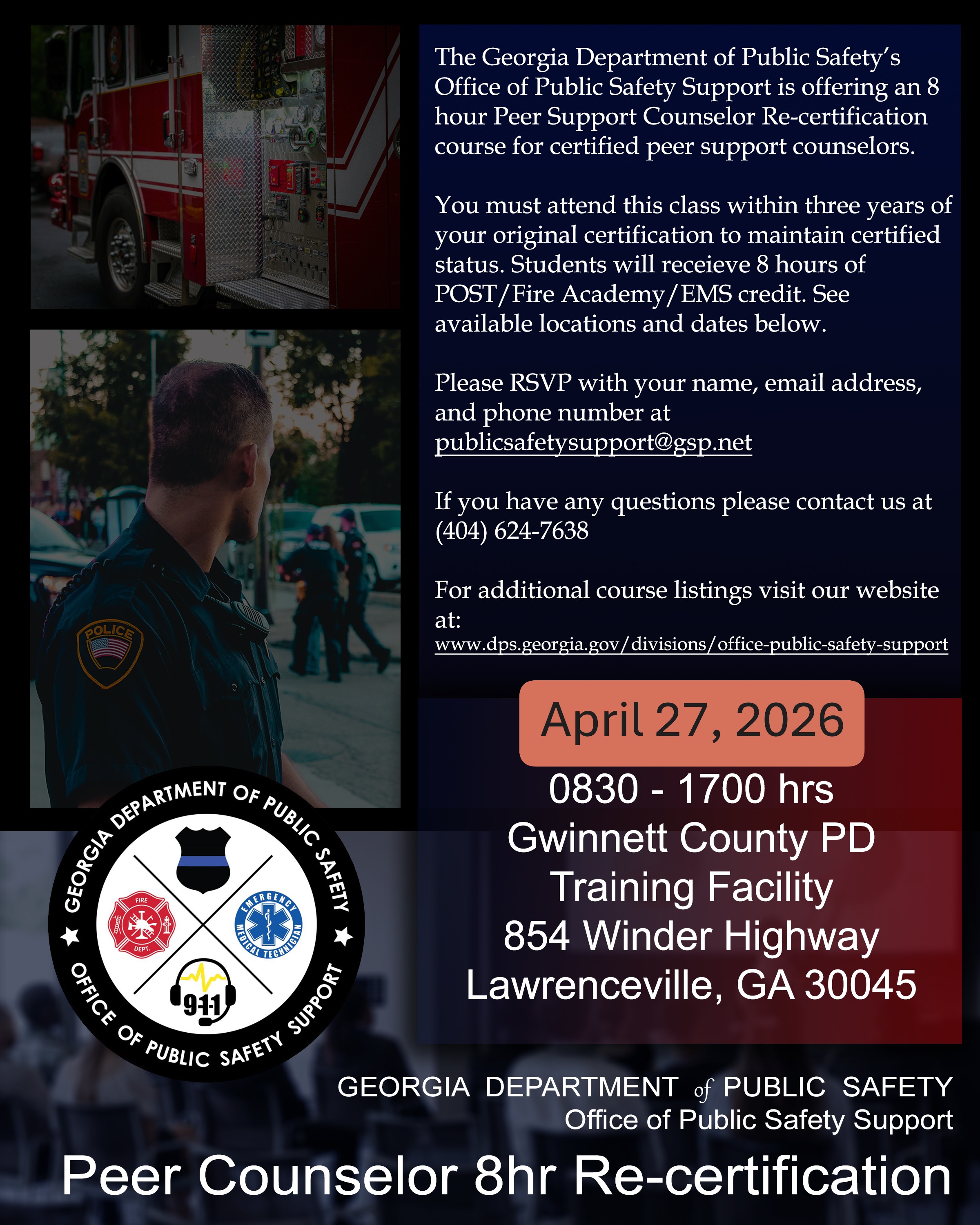 The Georgia Department of Public Safety's Office of Public Safety Support is offering an eight-hour Peer Support Counselor Re-Certification course for certified peer support counselors.